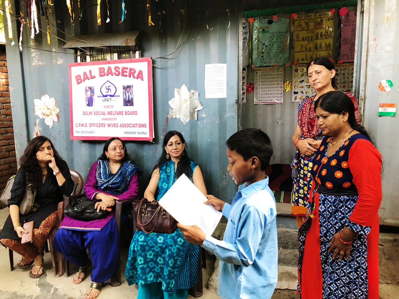 On the eve of Gandhi Jayanti the Executive Members of CPWD Officers' Wives Association visited the Bal Basera Creches at different sites. The children presented skits & short speeches on Mahatma Gandhi & "Swacchata Hi Sewa". They also took a 'Swacchata Pledge' under the guidance of their respective creche incharges. Refreshments were distributed to all the children.